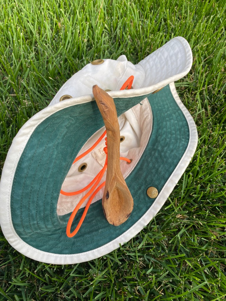 Fortunately, I was not alone. John was with us. And he is an outdoor survivalist. For those my age, remember the original TV show “MacGyver”? Well, he was MacGyver. Bush-crafting is John’s passion. And, wouldn’t you know it, he had some paracord handy – that orange rope that can hold up to 500 pounds. He cut some off, melted the ends with his lighter, and in no time had my hat all strapped up.