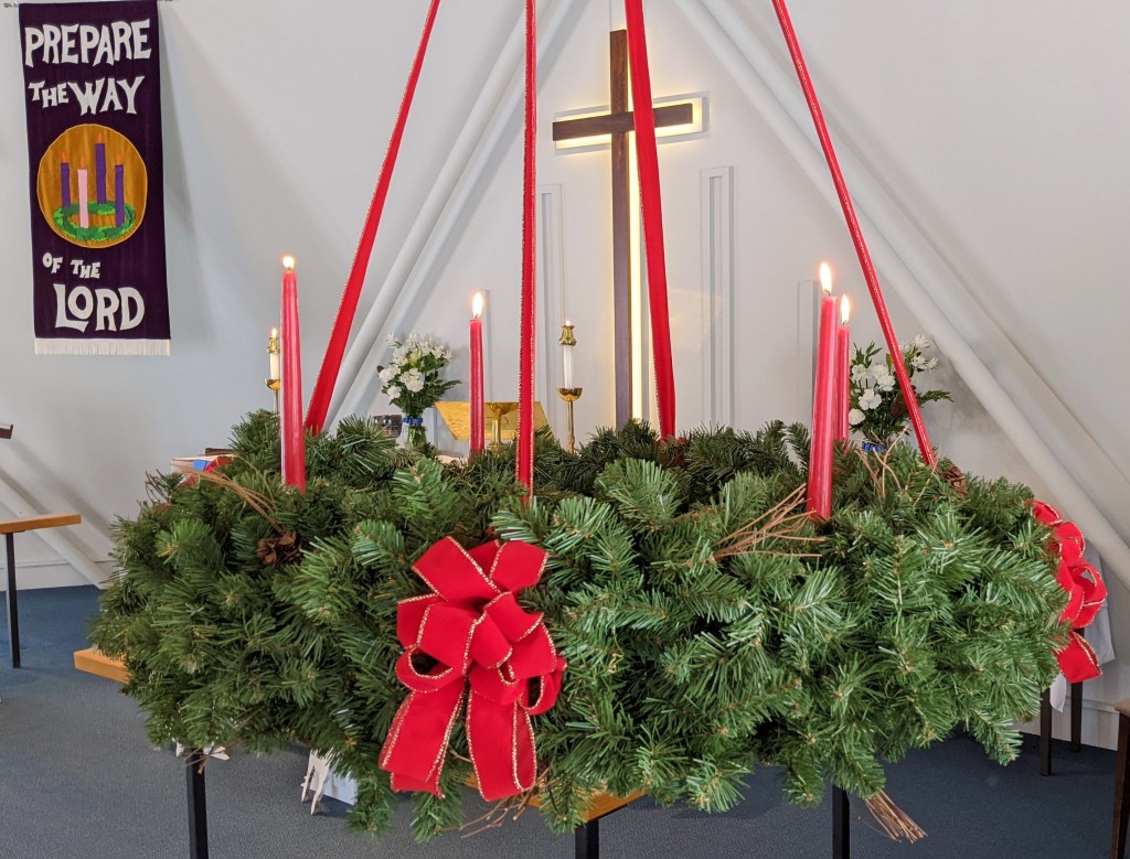 I’ve already reminded the congregation of GG’s gift to the church years ago of our beautiful Advent Wreath. Year after year in the season of Advent—the four weeks leading up to Christmas—the large circular wreath is hauled up on guy wires and hung in place from the ceiling of the sanctuary. Its candles, shining over the congregation, have lighted our steady journey towards Christmas for many years.