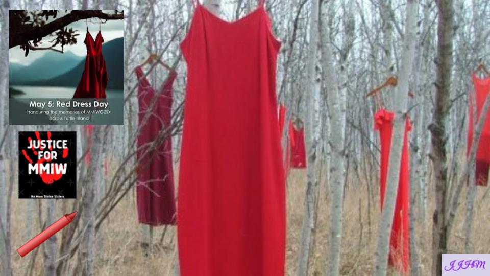 And that is why the church on May 5 recognizes the National Day of Awareness for Murdered and Missing Indigenous Women and Girls and Two Spirit People[1], who have been subject to disproportionate violence in Canada. This day is otherwise known as “Red Dress Day” inspired by Métis artist Jaime Black’s REDress Project installation, in which she hung empty, red dresses to represent the missing and murdered women.[2] Red dresses have thus become symbolic of this “hidden crisis”[3] in our country.