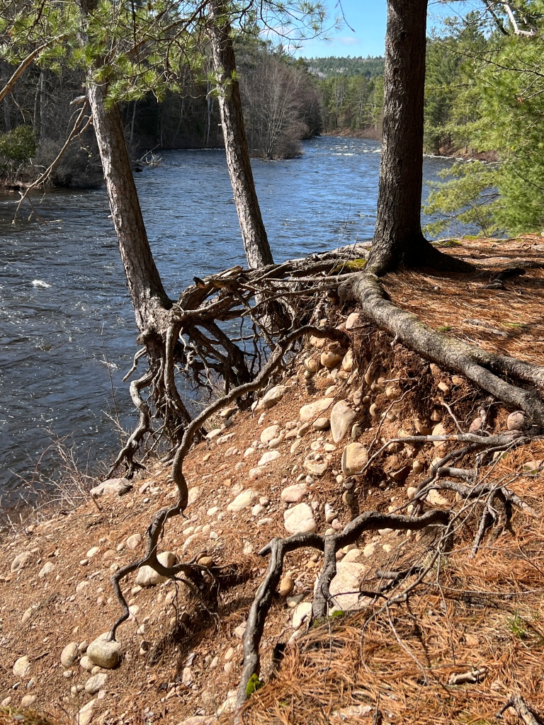 I looked up and around and then noticed that some thirty feet away in the corner of the yard close to our neighbour’s hedge line was a towering spruce tree reaching over eighty feet into the sky. From its base, facing me, one large root dove into the ground heading my way.